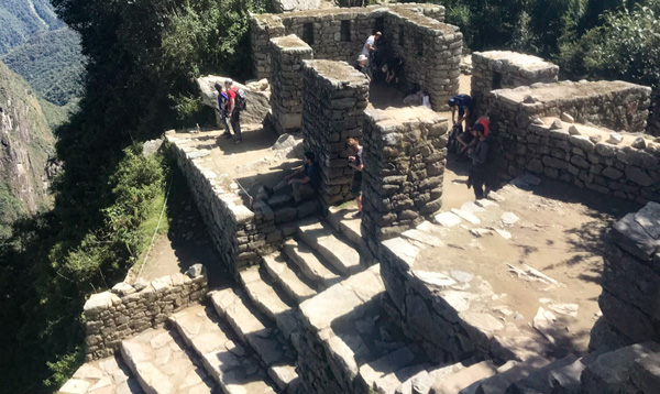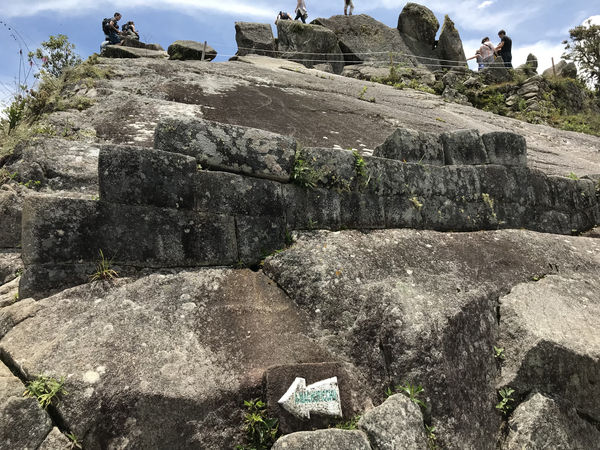 ワイナピチュの頂上は豪快な岩場栄光のワイナピチュ、その頂上制覇は簡単ではありません。苦しい思いを我慢した人のみが受けることのできる特権です。だからこそ、我慢してひたすら足を動かし続け、目の前に頂上の建造物が見えて来た時、最後の元気を振り絞って登りきったのです。11時50分、遂にワイナピチュの頂上に到達し、マチュピチュの全容を見下ろすことができました。頂上制覇、おめでとう!ここまで苦しい戦いになるとは思ってもおらず、水分を補給できたことが勝因の秘訣だったと思っています。