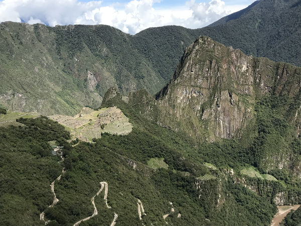 1時直前の下山ルートは登山客で渋滞!既に時刻は12時をまわり始めていました。ワイナピチュの閉門にも時間制限があり、1時にはゲートが閉まってしまうことから、再度、時間に追われながら下山を開始しました。山を下っていくと、マチュピチュ山の麓から砦へと向かって登るジグザグの山道が見えてきます。実に美しい光景であり、これを見るだけでも、苦しんで登山したかいがあったと思いました。山道を下る途中、狭く、急な箇所がいくつもあり、下山する登山客が列をなして山道が渋滞する場面がありました。ここはひたすらゆっくりと周囲と歩調を合わせながら下山を続け、12時56分、ワイナピチュのゲートに戻ることができました。無事、時間内にゲートから脱出成功!