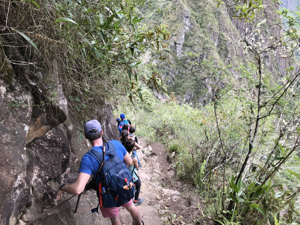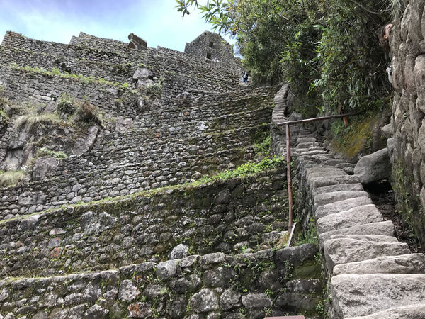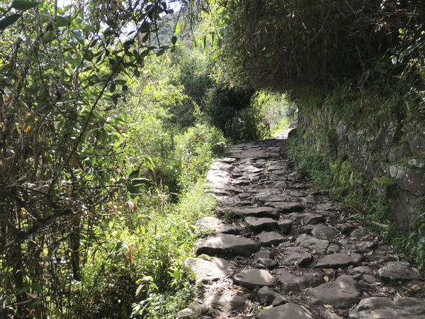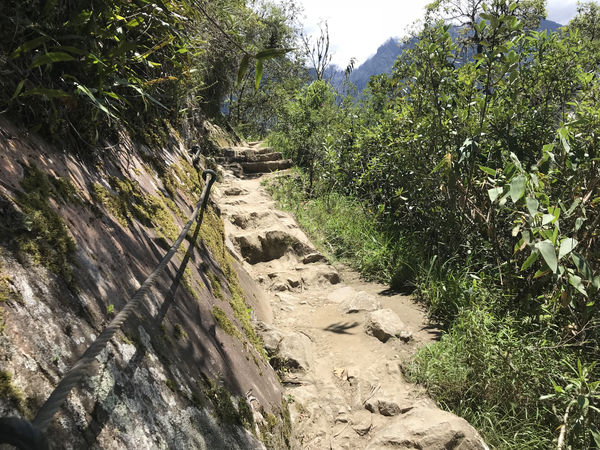 最初の坂道は簡単に見えたのだが。。。ワイナピチュは若い峰と意味の言葉であり、マチュピチュ砦の背後に聳え立つ標高2720mの山です。急斜面の登山コースであり、山道も狭いだけでなく、体力を大変消耗することから1日あたりの入場制限が設けられており、事前にチケットを購入した人のみが入場することができます。既に11時のチケットは取得していたことから、颯爽とゲートを通り抜け、マチュピチュツアーの最後を飾るワイナピチュにチャレンジです。