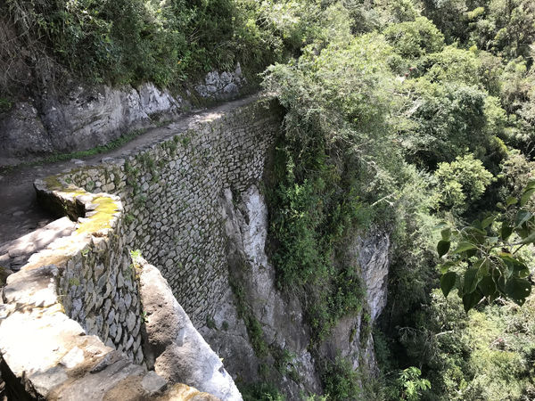 急いだかいもあり、何と10分少々でインカ橋へ向かう途中にあるゲートに着きました。そこからまだ、どのくらいの距離が残っているか知る由もないため、ひたすら走り続けることにしました。途中、崖っぷちの石垣付き山道を通り抜けると、その断崖絶壁沿いに作られた細い山道が見えてきました。インカ橋直前の山道は崖側に何ら柵がないため、落ちたら即死しそうな絶壁です。恐る恐る歩きながら、やっとの思いで10時23分、遂にインカ橋に辿り着きました。あまりに危険なため、今日ではインカ橋は通行止めになっており、誰も通ることができません。でも、昔の人々はこの難関を日ごろ行き来していたのかと思うと、ただ、驚くばかりです。