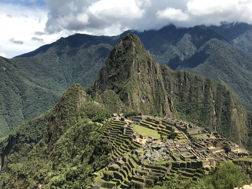 最期の難関となる急斜面の階段山道の所々からは、ワイナピチュの頂上が見えてきました。でも、頂上はまだまだ先です。頑張らなければと足を進めるのですが、だんだんと雲行きが怪しくなってきます。これまで登ってきた山道を振り向くと、かなりの急斜面であることがわかります。場所によっては傾斜が45度を超えているに違いなく、それがワイナピチュの登山であり、きつい理由です。そしてついに頂上が見えてくるも、その手前に最後の難関が潜んでいました。そこには崖っぷちの急斜面に沿った石垣の階段が重くのしかかっていたのです。その石垣の階段は長く、あまりに急なことから、途中で欧米人の方がギブアップして横たわっていました。それほどまでに、特に炎天下では過酷なチャレンジとなる最後の関門だったのです。あそこで水をもらってなければ、確実に脱水症状で自分も倒れていたことでしょう。