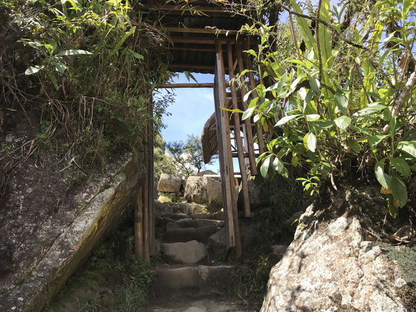 インカ橋への山道途中にあるゲート遠い昔からサンゲートとは、麓にある村から山を越えてマチュピチュへ行く途中に通る、関所や狼煙台のような場所でした。よって、サンゲートからの景色は格別です。山道は急斜面ではないものの、高地のせいか空気も薄く感じられ、気温はどんどんと上昇していることもあり、小走りしても息苦しくなります。しかもペットボトル1本しか持参してこなかったため、汗をかき始めて水を飲み始めると、いつ空になってしまうか、少し心配になってきました。ところどころ石が詰められている山道を、ひたすらサンゲートを目指しながら小走りに20分ほど進むと、背後の遠くには、マチュピチュを見下ろす景色が広がっていました。なかなかの絶景です。そして疲れを我慢して走り続けていると、遂に9時40分、サンゲートに到達することができました!