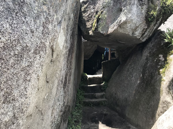 日本の霊峰にみられるような岩間の山道ワイナピチュの頂上に辿り着いて初めて分かったことは、頂上周辺が豪快な岩場となっているということです。日本の霊峰に多く見られるように、ピーク周辺には頂上石のような巨石が多くみられ、それらの合間に人が通り抜けできる山道が作られ、古来の人々は山を行き来していたのです。その山道の中には、岩間の間を通り抜ける通路や、トンネルのように岩がかぶさったものもあり、まさに日本人にとっては親しみやすい霊峰の様相を呈しています。