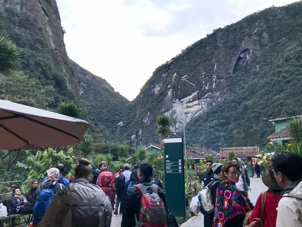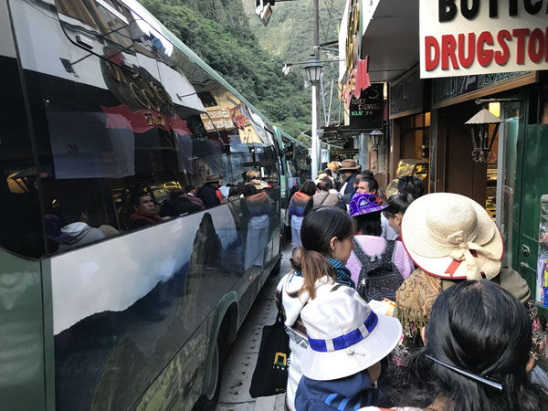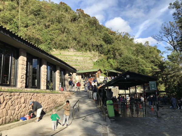 大勢の観光客で賑わうバス乗り場朝6時10分、約束の時間にアルベルト氏とホテルのロビーで合流した後、6時30分始発のバスに乗るために、すぐそばのバス乗り場まで歩いていきました。10分ほど歩いて橋を渡ると、そこにはすでに何台ものバスが並んでおり、早朝だというのに大勢の観光客で賑わっています。バスに乗り込むと同時に、6時35分には出発し、山道に向かって移動を開始しました。途中の道路は舗装されてはおらず、多少のでこぼこ道を、バスがぐんぐんと進んでいきます。そしてかれこれ30分ほど乗っていると、マチュピチュ遺跡のゲートが見えてきました。午前7時、ゲート周辺は、ちょっとした遊園地の入り口のような雰囲気でした。