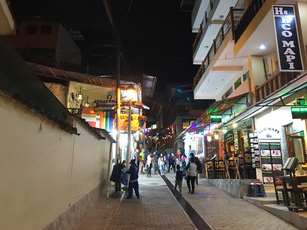 マチュピチュ村の夜これなら明日は安心と思い、和やかな雰囲気の中、終始リラックスして話を聞くことができました。そして翌朝、ホテルから一緒に出発するというプランを確認して会合は終了です。その後、ホテルで軽く食事をし、せっかくなので、マチュピチュ村に散歩に行きました。そこは村というより、どちらかというと日本にある温泉街のようなツーリスト向けの小さいアーケード的な商店街でした。いたるところに観光客がたむろしており、特に欧米諸国からのツーリストが多かったように思えます。楽しく食べて、飲んで、ショッピングして、遊べる、ちょっとしたリゾート感覚の風変りな町が、マチュピチュ村だったのです。
