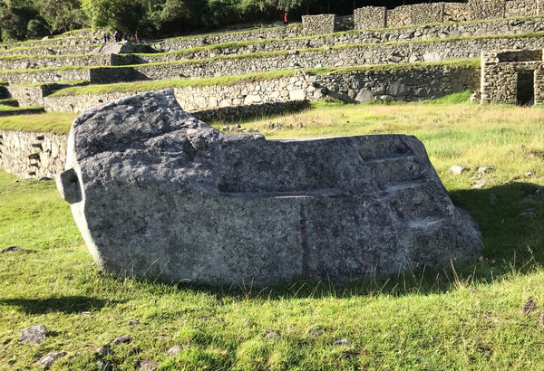 益田の岩舟に似た巨石のモニュメント遺跡のゲート周辺からのビューは素晴らしく、マチュピチュ砦全体を見渡すことができます。そして通路の上に広がる広場を見渡すと、巨石のモニュメントが目に入ってきました。どこかで見たような。。。「あ、そうだ、奈良にある益田岩舟にそっくりな岩!」、ということに気が付きました。岩場の周辺はインカ遺跡に見られる段々畑の広場が続き、とても美しい光景でした。直後、マチュピチュ砦の方へと向かい、遺跡の詳細についての説明を聞き続けながら、アルベルト氏と歩いて回りました。