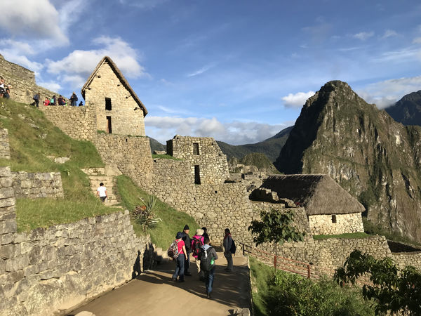 アルベルト氏と一緒にゲートを通り抜け、マチュピチュ遺跡の中に入ると、すぐに細かい説明が始まりました。まずは道順からです。およその感覚としては、左手の奥の方に続く山道の先にはインカ橋があり、左側手前にUターンして山を登るとサンゲートに到達できるとのことです。そして右手にはワイナピチュがマチュピチュ砦の背後に聳え立っていました。インカ橋やサンゲートへの山道がどのくらい長いか想像もつきませんでしたが、サンゲートまでは往復2時間、インカ橋は1.5時間とも聞いていたことから、かなりの距離は覚悟しなければならなそうです。