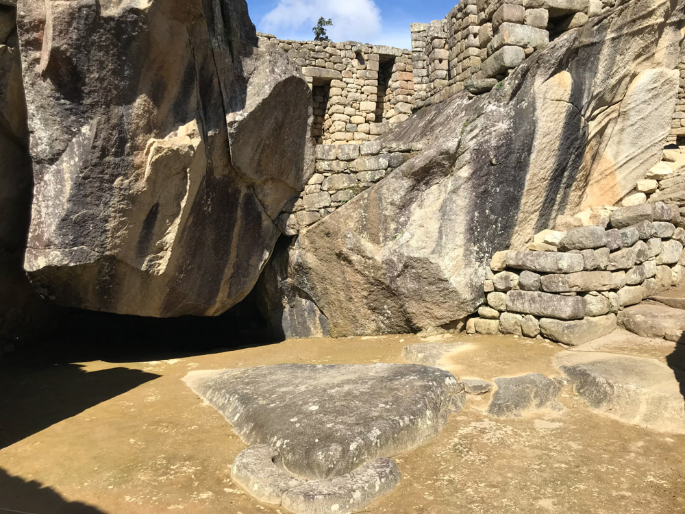 曲線の石組が美しい「太陽の神殿」マチュピチュの散策を続けながら、アルベルト氏から聞いた話の中でも特に興味深かったのは、遺跡と太陽との関係、そこに作られた太陽の神殿、そして石を削って構築された建造物の精度です。マチュピチュ砦を歩き回ると、太陽の神殿に近くなればなるほど石積みの精度があがり、より細かい箇所まできちんと石が積み上げaられていることがわかります。特に神殿回りでは意図的に軽いカーブをつけて石が切られている場所があり、その少しの隙間をもって、地震の揺れを吸収できるような耐震構造になっているとのことでした。それらの石は大きく、切るだけでも大変なのに、その巨石を移動しながら積み上げていく技術と、設計精度の素晴らしさに驚いてしまいました。とにかく写真をとりまくり、記念に保管しておくことに努めました。
