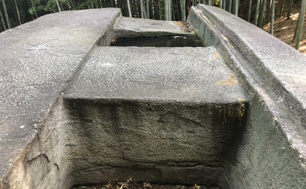 - 建造途中の横口式石槨説 まず、未完成の一石二室の横口穴式の石槨(せっかく)として、遺体を収める石棺や副葬品を収納する古墳のような役目を果たしていたという説があります。通常の石槨は横向きに口が開いていますが、益田岩船の場合は横口が天井を向く形に回転したと考えます。益田岩船の近くに発見された牽牛子塚古墳の横口式石槨の開口部における形状と、益田岩船の2つの穴の形状が類似していることから、同等の目的をもって造られたのではないかと推測するのです。