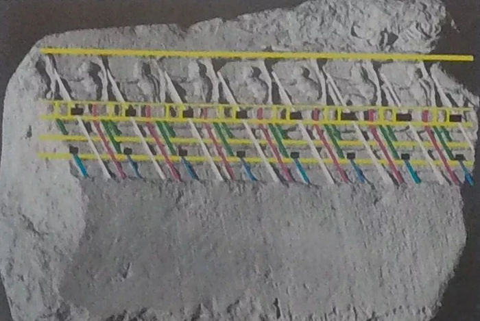 紀元前10世紀以上にもなる遠い昔の時代から、西アジアを中心に人類は船で遠洋まで航海していたことが知られています。イスラエルではソロモン王の時代、すでにタルシシ船がアフリカ大陸からアジア大陸に向けて航海を繰り返していました。その後、紀元前5世紀、古代ギリシャでは三段櫂を搭載したトライリムと呼ばれた戦艦も歴史に姿を現しました。トライリムの漕ぎ坐は3段になっていることから、船の横には三段に櫂が飛び出し、船底に向けて海面に近い箇所から四角形の窓が積み重なっていたのです。考古学の資料分析から描かれた古代トライリムの図を参照すると、その升目状にデザインされている三段櫂の有様は、多くの格子状デザインが積み重なったようにも見えます。もしかすると、船の櫂が出る窓を思いおこしながら格子状のデザインを用いて切り込みを入れ、益田岩船の表面を上部から削って磨いたのかもしれません。