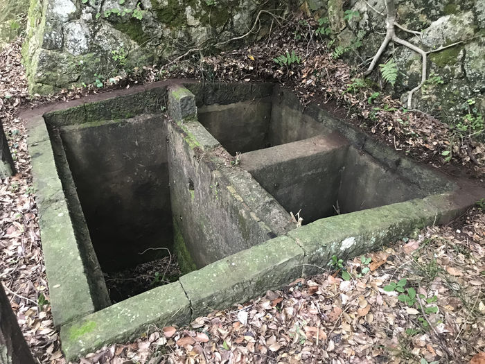 日露戦争時に要塞化された城山砲台跡山の頂上近くにあることから、戦略的にも重要な場所です。よって、これらの穴に何かを保管するとするならば、それは遺物や故人の墓に関するものではなく、戦争に勝つためのお守りや神宝の類ではなかったかと推察されます。もちろん、そのまま中にいれてしまうと、雨が降る度に水びたしになってしまうことから、保管する容器にいれたうえで、上から蓋をしたのではないかと想定されます。これらも憶測にしかすぎませんが、2つの正方形の穴の用途を解明する手掛かりになるかもしれません。